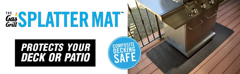 The Gas Grill Splatter Mat is a 30-inch by 48-inch flexible pad, composed of two non-woven fiber materials separated by a patented barrier media that protects surfaces from grease and sauce drippings. The materials are 100% recyclable and unlike similar products on the market today, the non-woven surface areas of the splatter mat will not bond or adhere to composite decking. 30-inch by 60-inch size also available for larger gas grills. Please note: We continue to test new deck products for compatibility with "The Gas Grill Splatter Mat," and they are compatible with many of the composite product and exotic woods we have tested. The Mat will not stick to a composite deck surface as it contains no rubber backing material. As with any object resting in one place for extended periods, weather and exposure conditions of the area protected by "The Gas Grill Splatter Mat" will differ from the surround area not protected by the Mat. Therefore, you may notice differences in appearance between the area directly under "The Gas Grill Splatter Mat" and surrounding, unprotected areas upon removal of the Mat. With proper maintenance, you will have no trouble keeping your Mat and deck in great shape for many years!